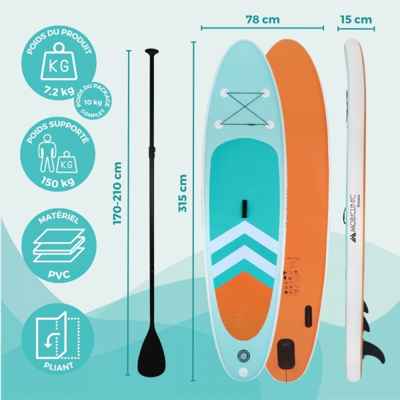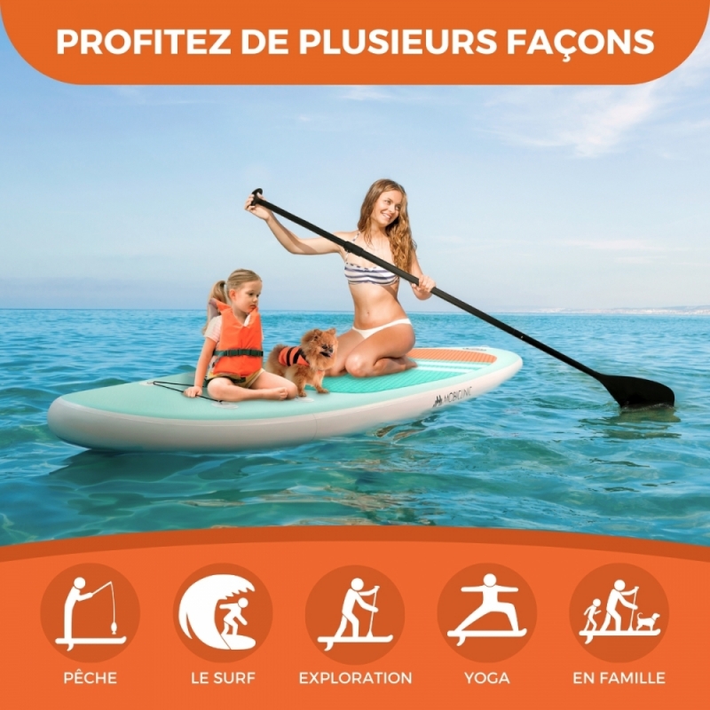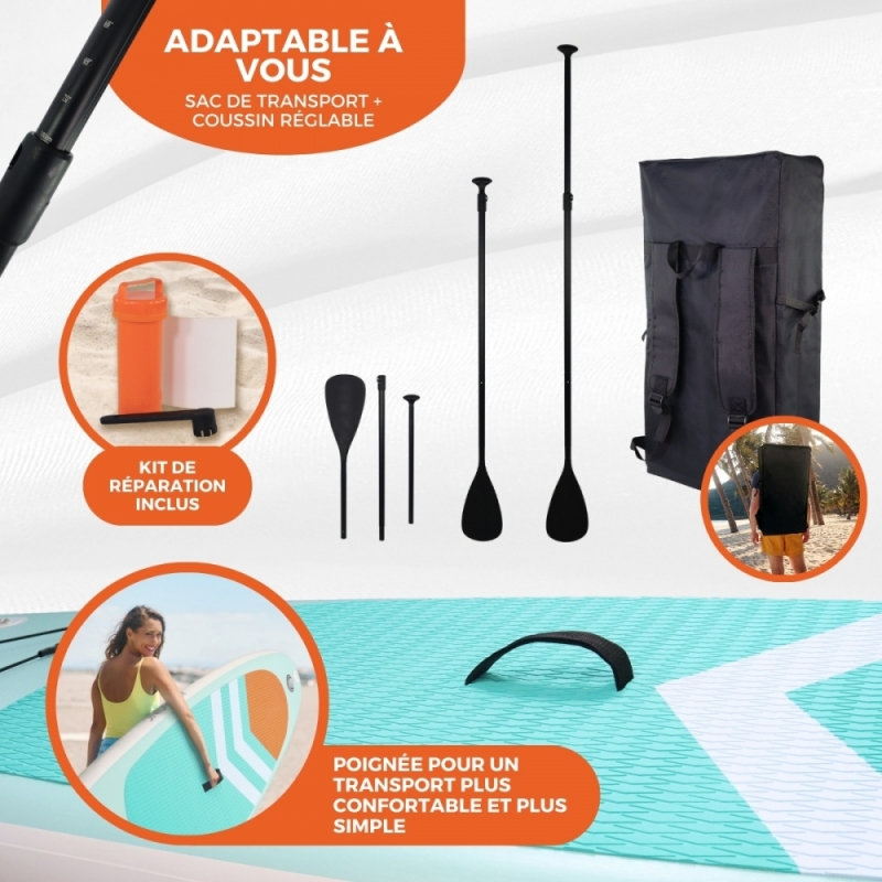 TRANSPORT FACILE : Grâce à son sac à dos inclus , emporter votre planche de paddle surf partout est facile et sans tracas. Léger et résistant, il permet d'explorer de nouvelles destinations nautiques sans se soucier du transport. De plus, une fois gonflé, vous pourrez le transporter facilement grâce à sa poignée de transport .