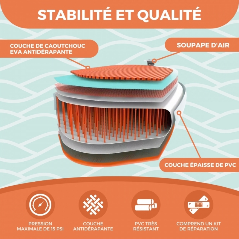 STABILITÉ ET MANIABLE : Equipée de 3 ailerons stables et d'un design soigné, notre planche offre un équilibre parfait entre stabilité et maniabilité. Cela signifie que vous pouvez affronter une variété de conditions aquatiques en toute confiance.
