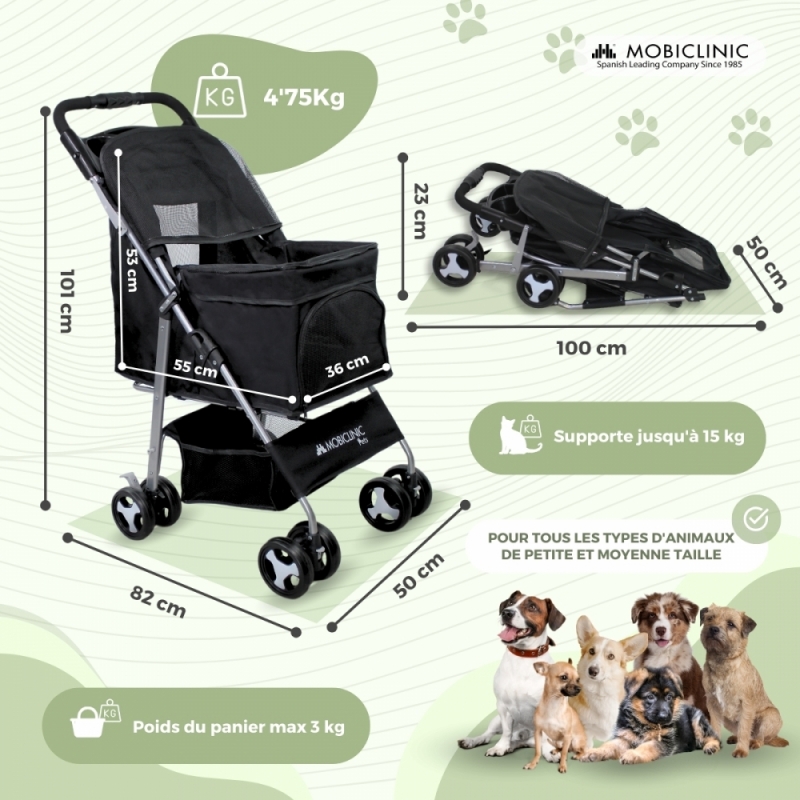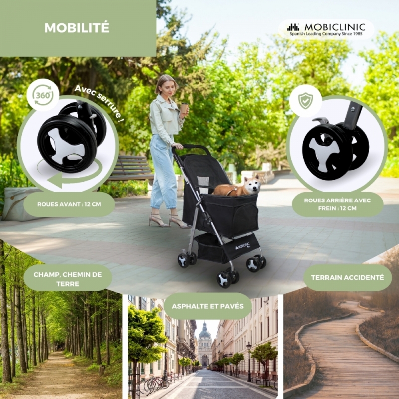 Poussette pour chien|Pliable|Roues frein et 360º|3 accès |Auvent| Panier de rangement et porte-gobelet |Noir|Zuma|Mobiclinic