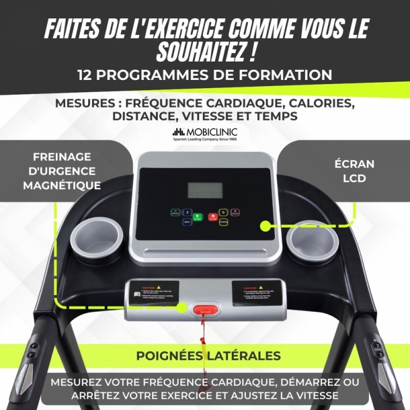 La personnalisation est la clé de l'approche du tapis roulant Etna en matière de fitness. Avec 3 modes de levage manuels (ajustables sur la face inférieure du tapis roulant) et 12 programmes d'entraînement prédéfinis , il vous permet d'adapter l'intensité de l'exercice pour vous concentrer sur la combustion de calories, le renforcement musculaire ou l'amélioration de l'endurance cardiovasculaire. La possibilité d' ajuster l'inclinaison offre de la variété dans votre routine d'entraînement, aidant à éviter un plateau et à maintenir l'intérêt au fil du temps.