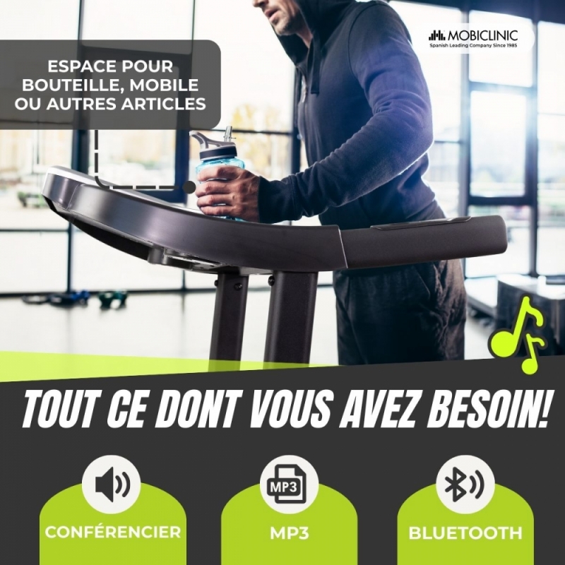 ÉCRAN LCD AVEC BLUETOOTH, HAUT-PARLEUR ET SUPPORT : Ce tapis de course est équipé d’un écran LCD affichant toutes les informations nécessaires (durée de l’entraînement, programme sélectionné, fréquence cardiaque, etc.). Il dispose également d’un haut-parleur Bluetooth ( FS-C98A35-A) pour écouter de la musique pendant l’effort, ainsi que d’un compartiment pour une bouteille d’eau et un téléphone portable.