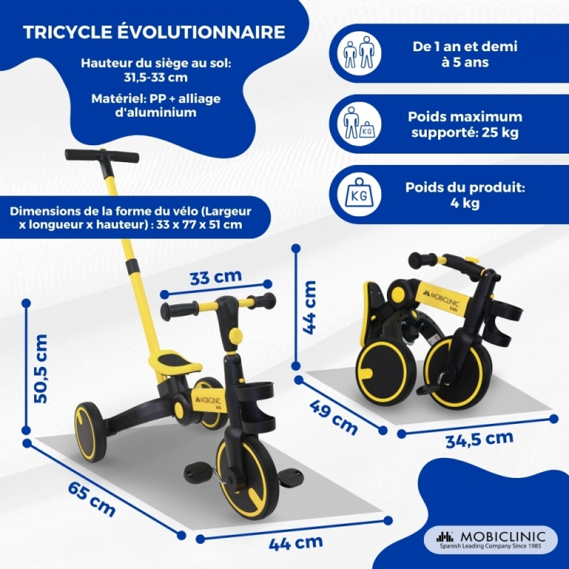 Tricycle 5 en 1 | Convertible | Réglable | Max 25 kg | Léger | 1,5-5 ans | Jaune | Chase | Mobiclinic