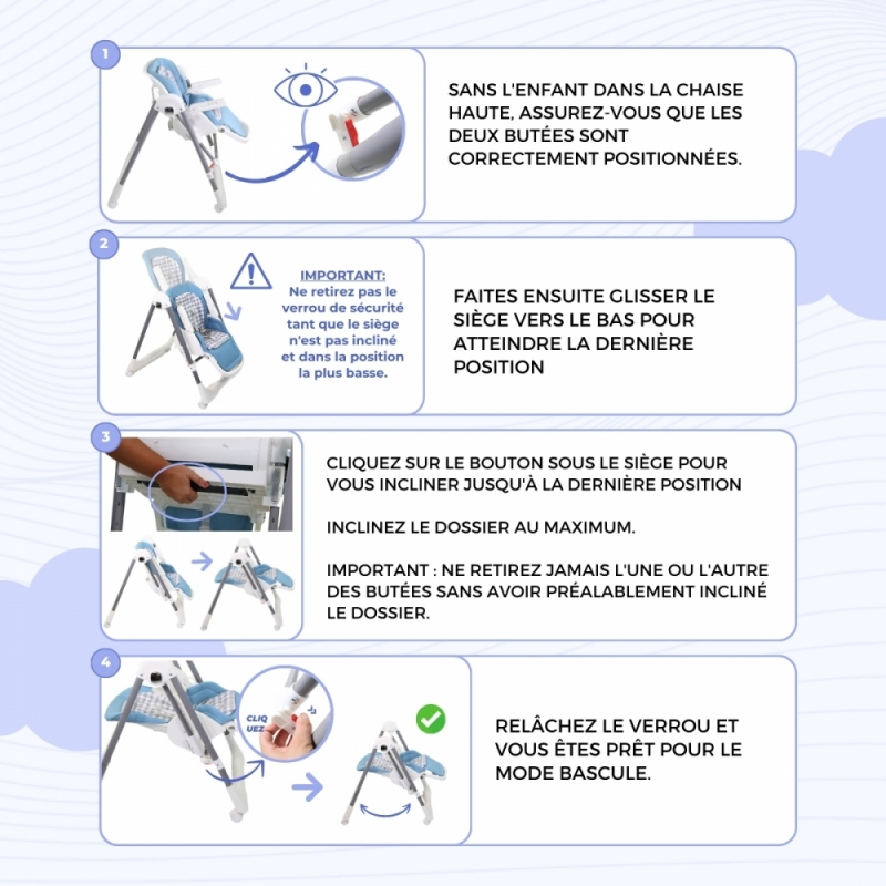 - Être 2 produits en 1 : grâce à sa fonction chaise haute et bascule, il n'est pas nécessaire d'acheter les deux produits séparément et les enfants pourront profiter de la chaise haute pour manger et de la bascule pour se reposer.
