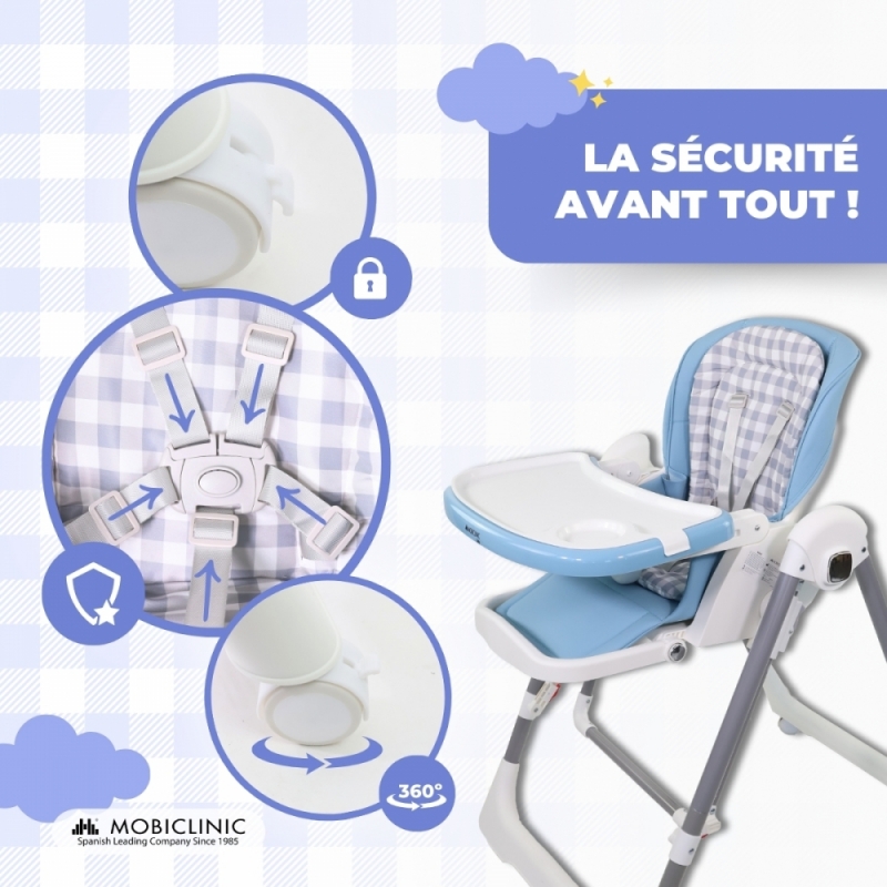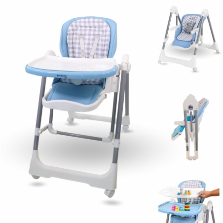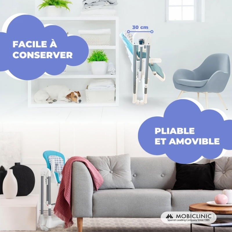 Chaise haute à bascule | Pliable | Avec roulettes et plateau | Max. 15kg | 6-36 mois | Ajustable | Bleu | Nala | Mobiclinic