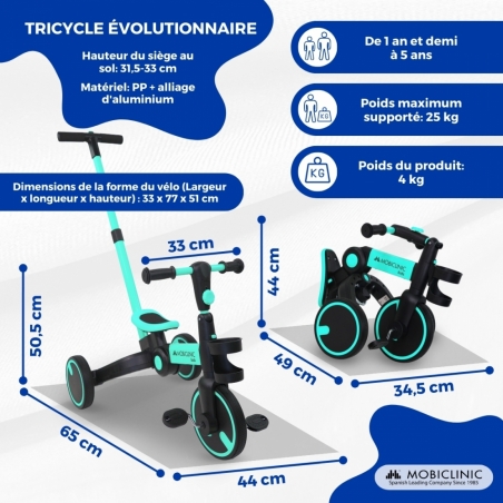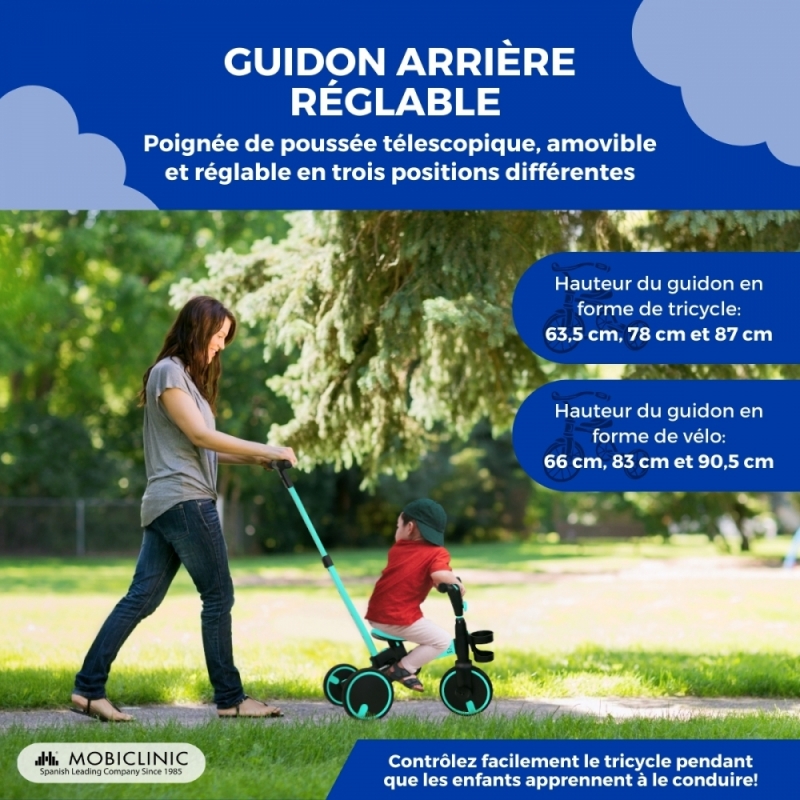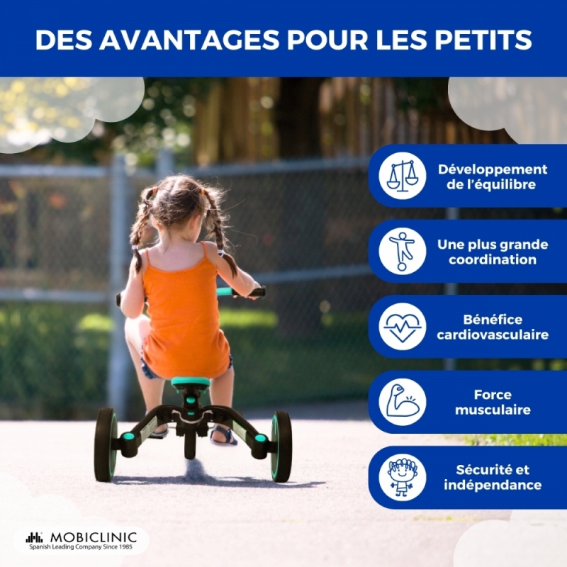 - Son adaptabilité et sa polyvalence : ses pièces réglables et amovibles offrent un tricycle qui se transforme en vélo à mesure que l'enfant grandit.