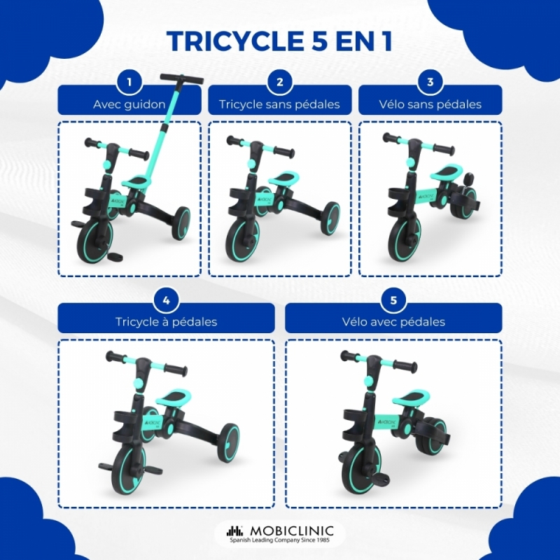 Tricycle 5 en 1 | Convertible | Réglable | Max 25 kg | Léger | 1,5-5 ans | Bleu | Chase | Mobiclinic