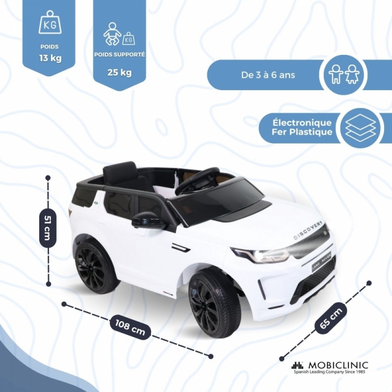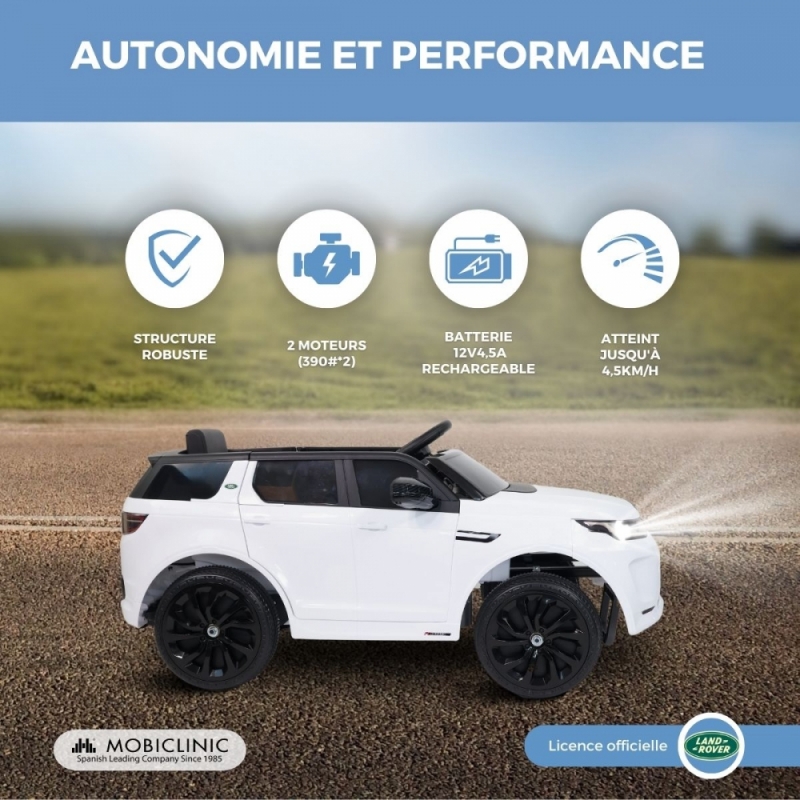 LICENCE RANGE ROVER : Cette voiture à batterie pour enfants est sous licence officielle Range Rover, garantissant une apparence réaliste du véhicule. Il est équipé d'une batterie 12V4,5A et peut atteindre une vitesse modérée, idéale pour les enfants entre 36 et 72 mois. Avec son design blanc élégant et ses détails réalistes, il captivera tout petit aventurier !