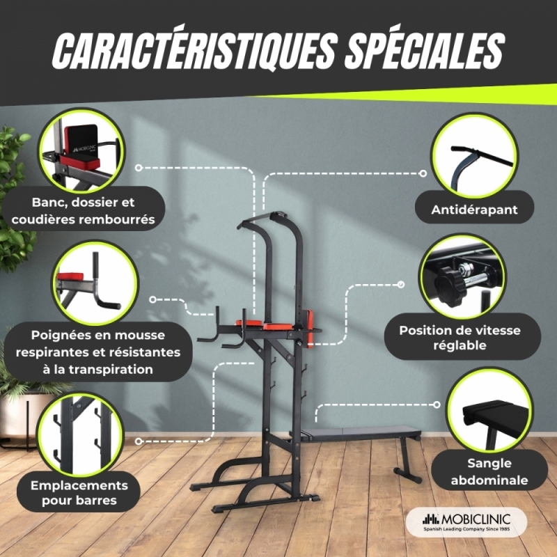Les poignées ergonomiques antidérapantes permettent une prise en main confortable, évitant les mauvaises postures qui pourraient endommager les poignets. De plus, le dossier offre un soutien supplémentaire pour les exercices tels que les levées de jambes, garantissant une pratique plus sûre et plus efficace. Avec ses dimensions pliables, cette station est facile à ranger et à transporter , ce qui en fait une option idéale pour ceux qui souhaitent une salle de sport à domicile sans prendre trop de place.