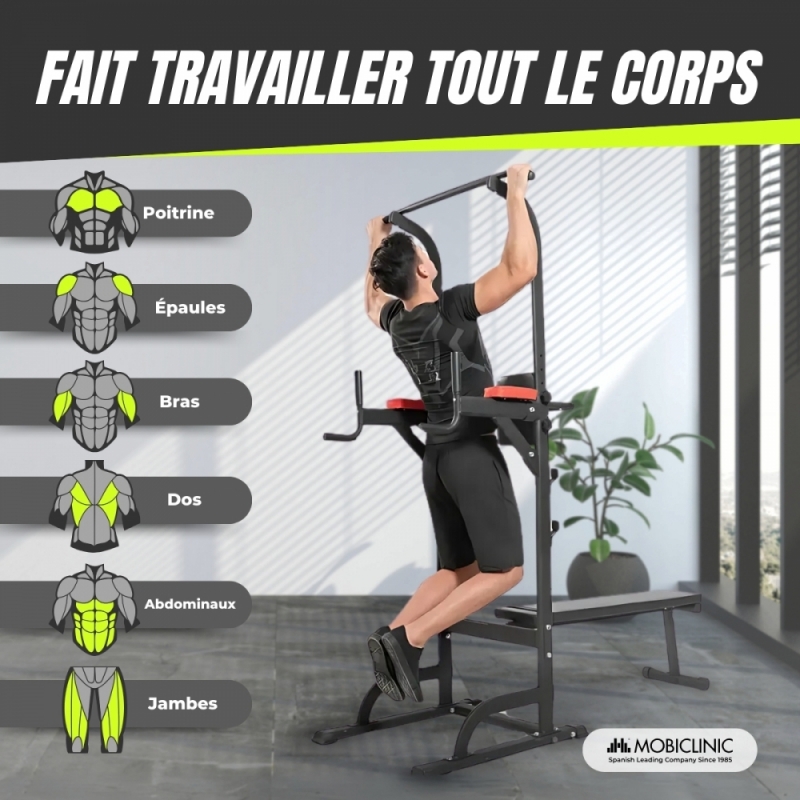 Multifonctionnalité dans un seul équipement : Cet équipement de fitness 9 en 1 vous permet d'effectuer une grande variété d'exercices : levées de jambes, développé couché, tractions, squats, etc. Idéal pour améliorer la force du haut du corps et favoriser un développement physique complet.