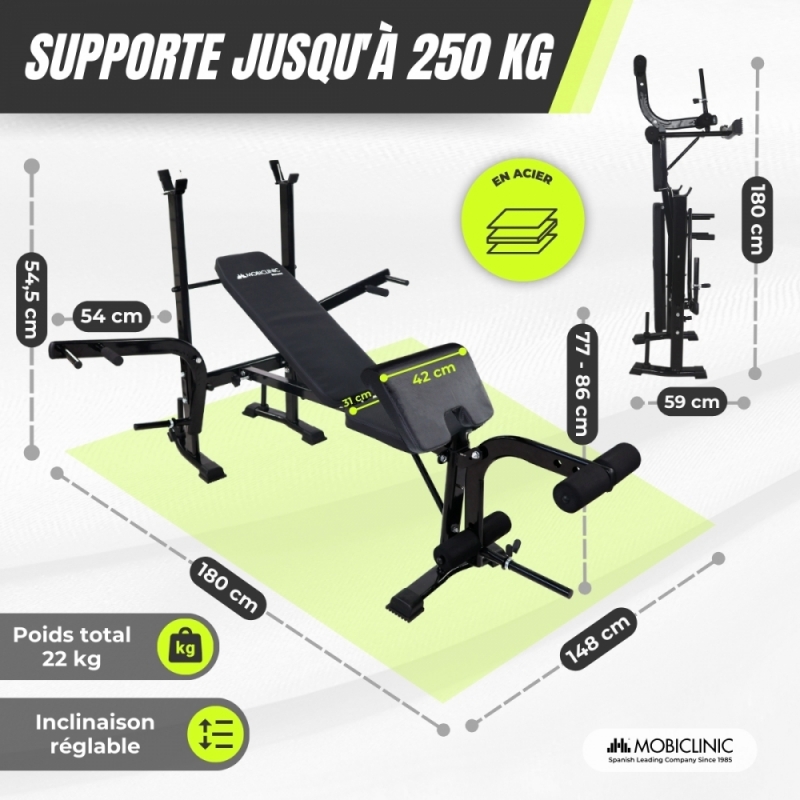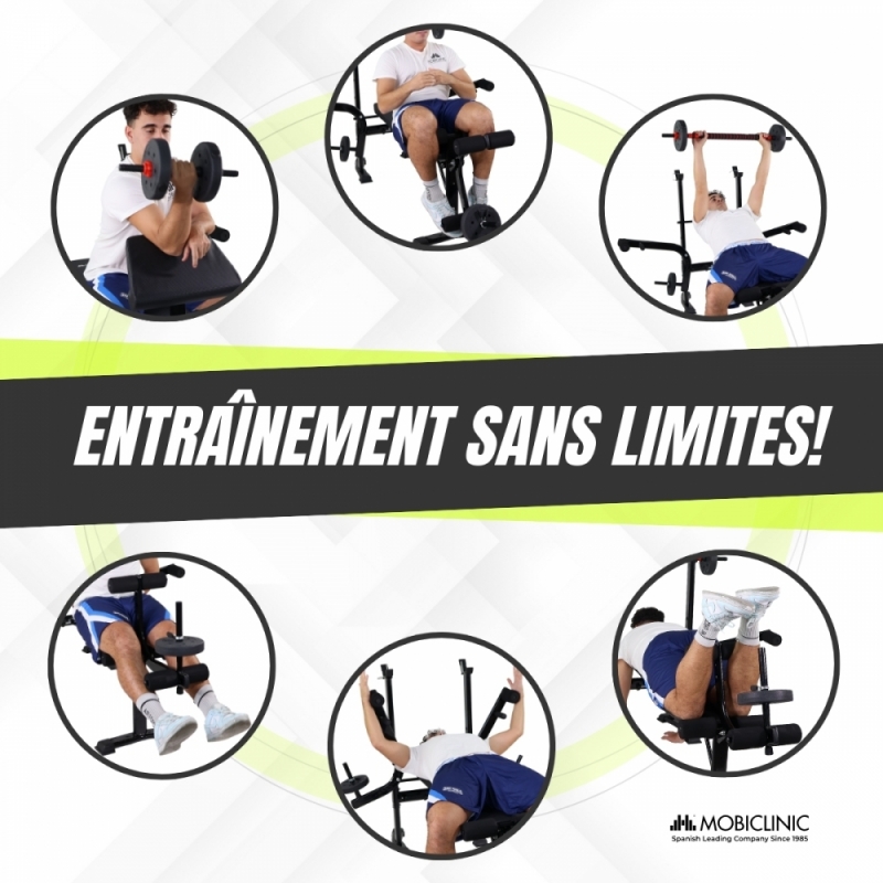 Banc de musculation multifonctionnel | Pliable | Réglable | Support de barre | 148x180x110,5cm | 250kg | Pressfit | Mobiclinic