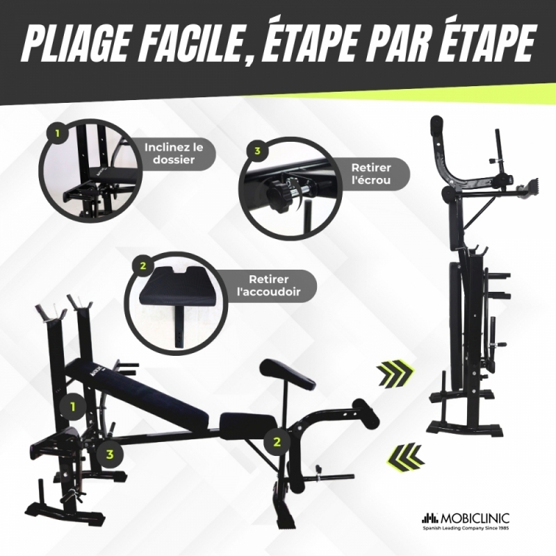 PLIABLE ET FACILE À RANGER : Ce banc est facilement pliable, permettant un rangement pratique dans n'importe quel coin de la maison. Malgré sa structure robuste et sa capacité de charge maximale de 250 kg, il peut être déplacé facilement, s'adaptant à n'importe quel espace sans compromettre la qualité de l'entraînement.