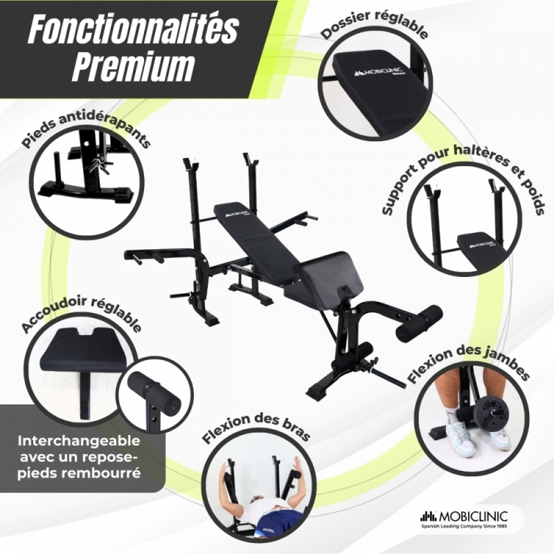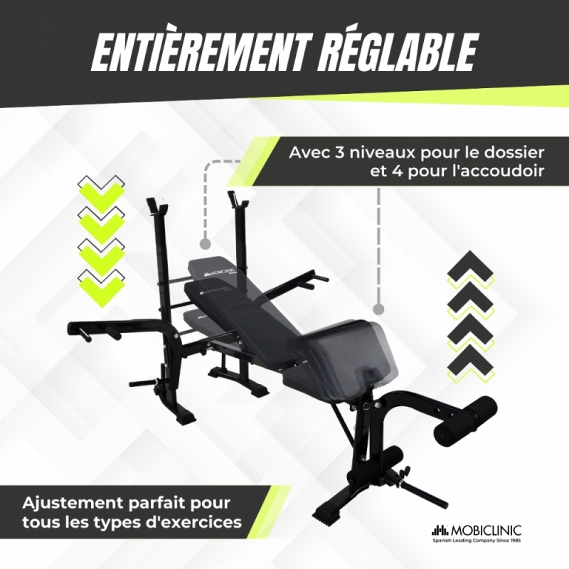 La polyvalence est l'une de ses principales caractéristiques : il permet d'effectuer jusqu'à 7 types d'exercices différents, tels que le développé couché, les squats, les redressements assis et les pompes. Grâce à cette variété, les utilisateurs peuvent maintenir une routine d'entraînement efficace et personnalisée.
