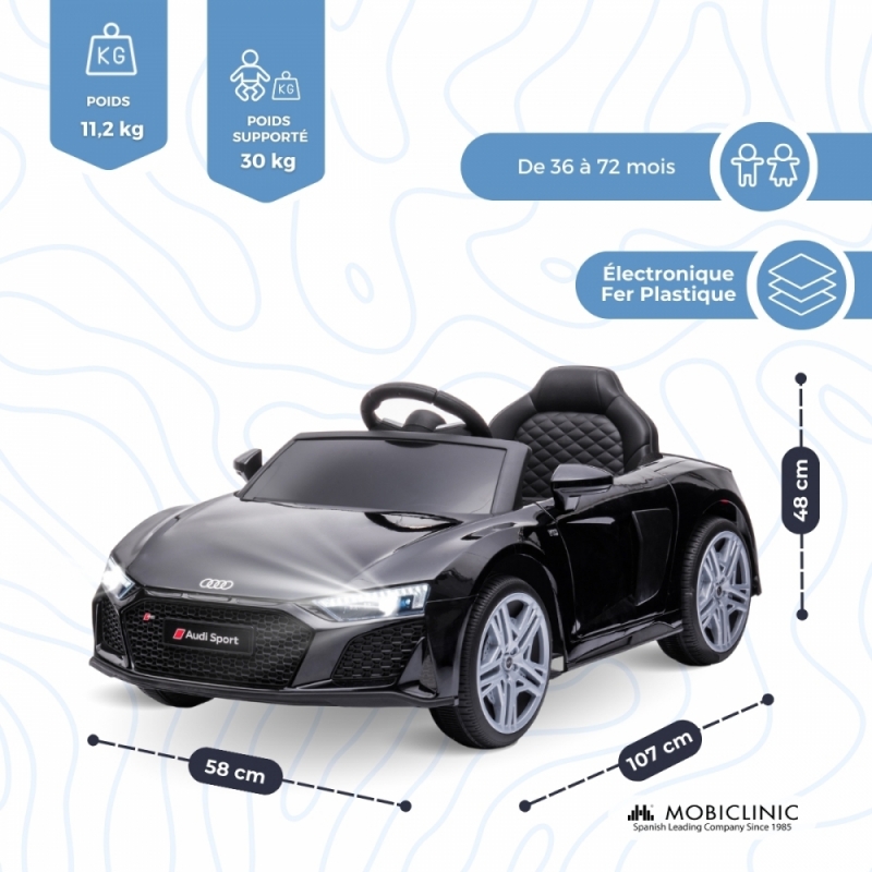 La voiture électrique MobiSporty, sous licence Audi R8 Spyder, est conçue pour offrir une expérience de conduite authentique et sûre aux plus petits. Avec des dimensions de 107 cm de long, 58 cm de large et 48 cm de haut, cette voiture électrique est parfaite pour les enfants entre 36 et 72 mois, offrant une manière ludique et éducative de développer la motricité et la coordination.