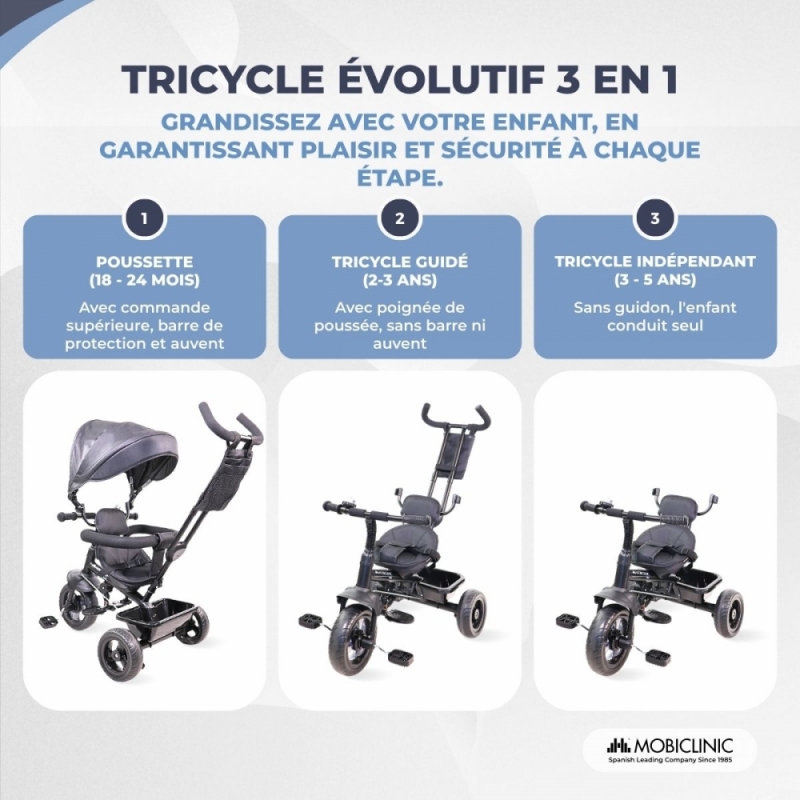TRICYCLE ÉVOLUTIONNAIRE 3 EN 1 : ce tricycle adapte son utilisation au fur et à mesure que les capacités de nos petits se développent. Du contrôle parental jusqu'à ce qu'il devienne un élément autonome d'amusement et de divertissement. Conçu pour les enfants de 18 mois à 5 ans d'un poids maximum de 25 kg.