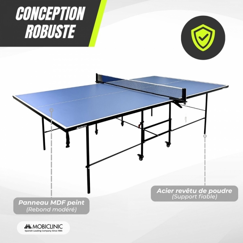 MATÉRIAUX DE QUALITÉ ET DURABLES : La table de ping-pong Tokyo Blue est dotée d’un plateau en MDF recouvert de PVC bleu, ce qui améliore la flexibilité de la balle pour un jeu dynamique. Ses pieds en acier thermolaqué lui confèrent une excellente résistance aux chocs et à la corrosion, ainsi qu’une grande durabilité.