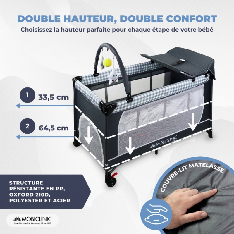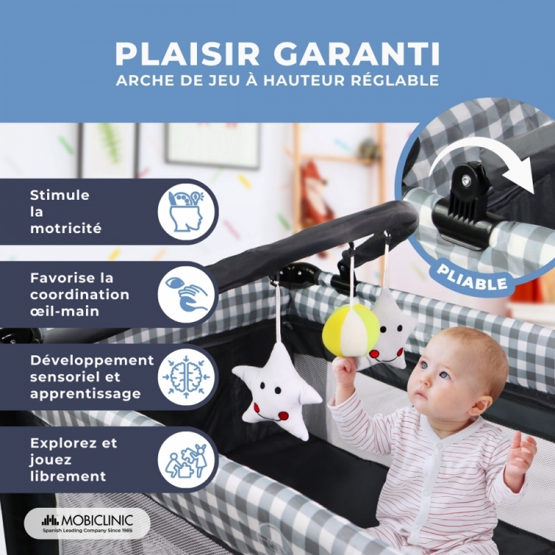 ACCESSOIRES : Ce lit de bébé 3-en-1 est équipé de plusieurs accessoires qui améliorent l'expérience du bébé et des parents. Son arche de jeu favorise l'amusement et stimule le développement cognitif de bébé. La table à langer avec pochette de rangement permet à la famille d'avoir tout à portée de main en un clin d'œil. Son sac de transport facilite la mobilité et est idéal pour emporter le berceau partout. Et enfin l' entrée latérale avec fermeture éclair qui permet au petit d'entrer et de sortir facilement, offrant confort et accessibilité.