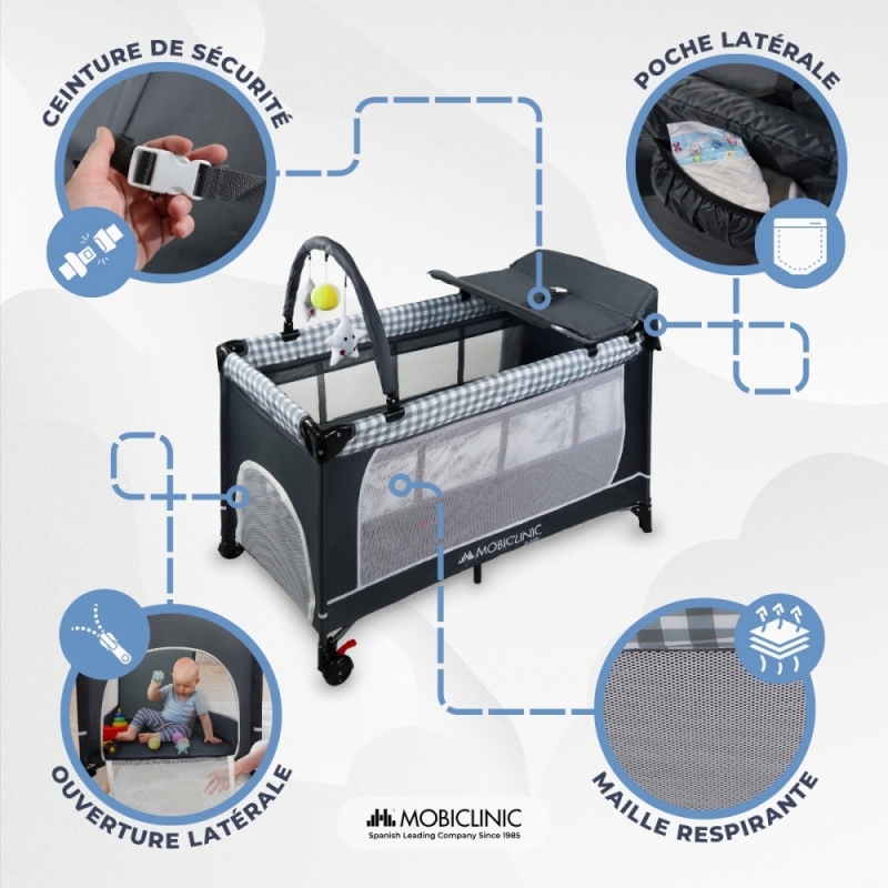 Le matelas à langer intégré comprend une ceinture de sécurité et une poche de rangement pratique pour garder les essentiels organisés pendant le changement des couches. De plus, il dispose d'une arche de jeu qui stimule le développement de bébé tout en s'amusant. Le berceau se distingue également par son pliage facile, ce qui facilite son transport et son rangement. Comprend un sac de transport pour qu'il soit pratique à emporter partout.