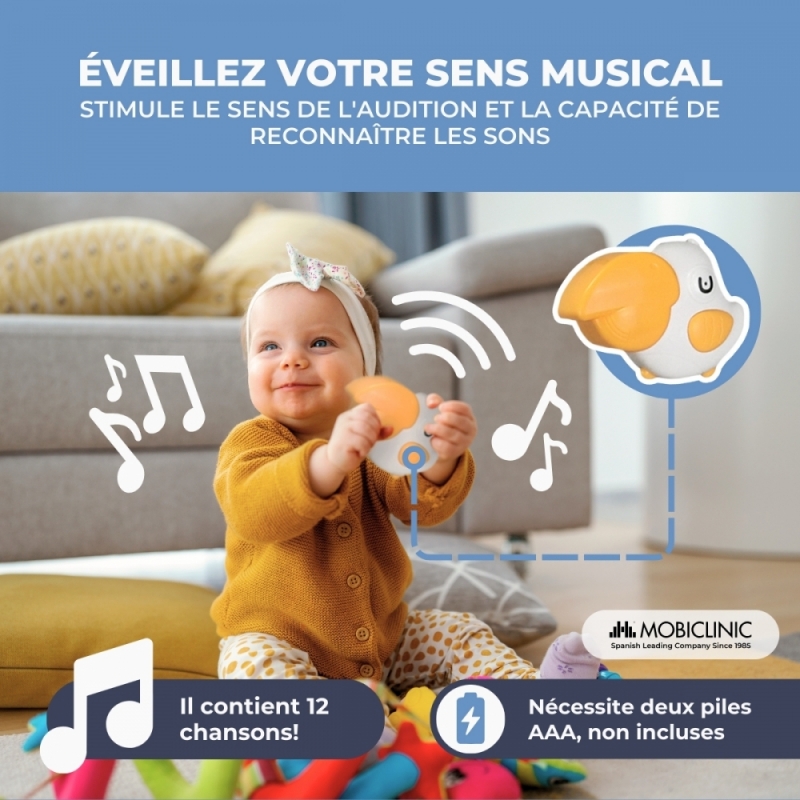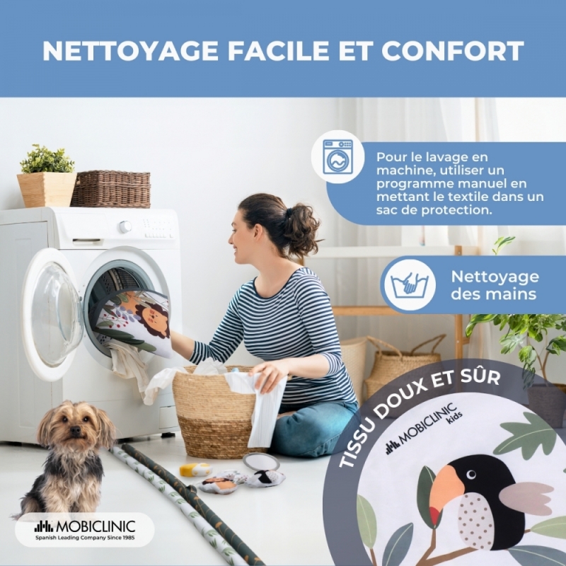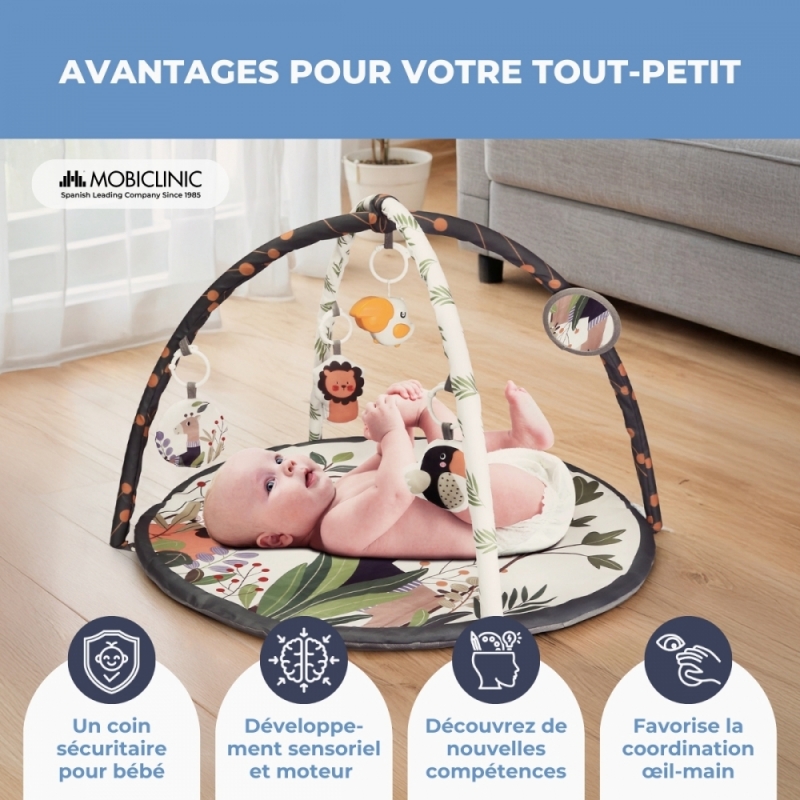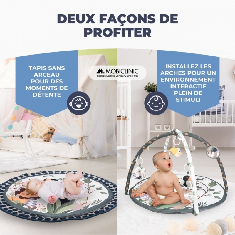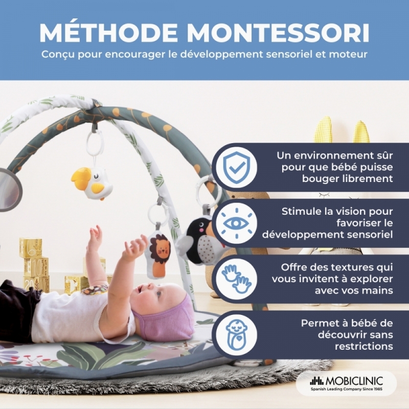 Il possède une arche interactive amovible qui contient divers jouets que le bébé peut atteindre, saisir ou pousser en étant allongé sur le tapis, ce qui favorise la coordination œil-main. Chaque jouet est conçu pour stimuler les différents sens, à la fois le toucher, la vue et l'ouïe. Ses accessoires sont 5 jouets : un miroir qui aide l'enfant à reconnaître sa propre image et à développer sa conscience de soi ; un perroquet avec de la musique avec 12 chansons amusantes qui stimulent le sens auditif de bébé, aidant sa capacité à reconnaître les sons et les rythmes ; deux poupées en coton pour le développement de la motricité finale et enfin, un jouet au son crépu qui encouragera l'interaction et la curiosité lorsqu'on le pressera.