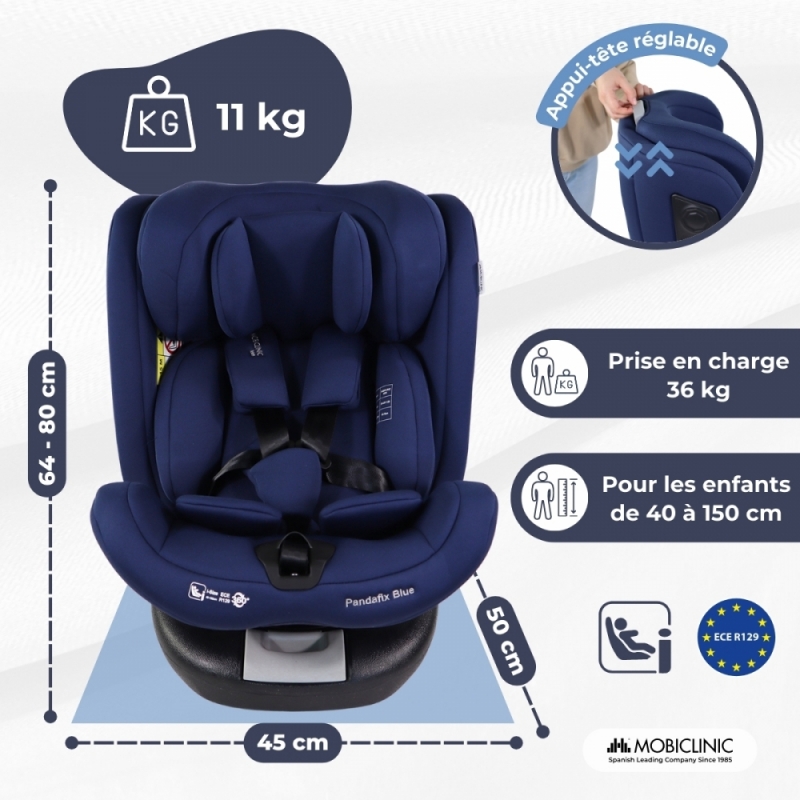 RÉGLABLE : Il dispose d'un appui-tête réglable sur 10 positions qui s'adapte au développement de l'enfant, assurant une protection optimale au fur et à mesure de sa croissance. De plus, le siège auto Pandafix a la possibilité de s'incliner dans plusieurs positions, aussi bien face à l'avant qu'à l'arrière.