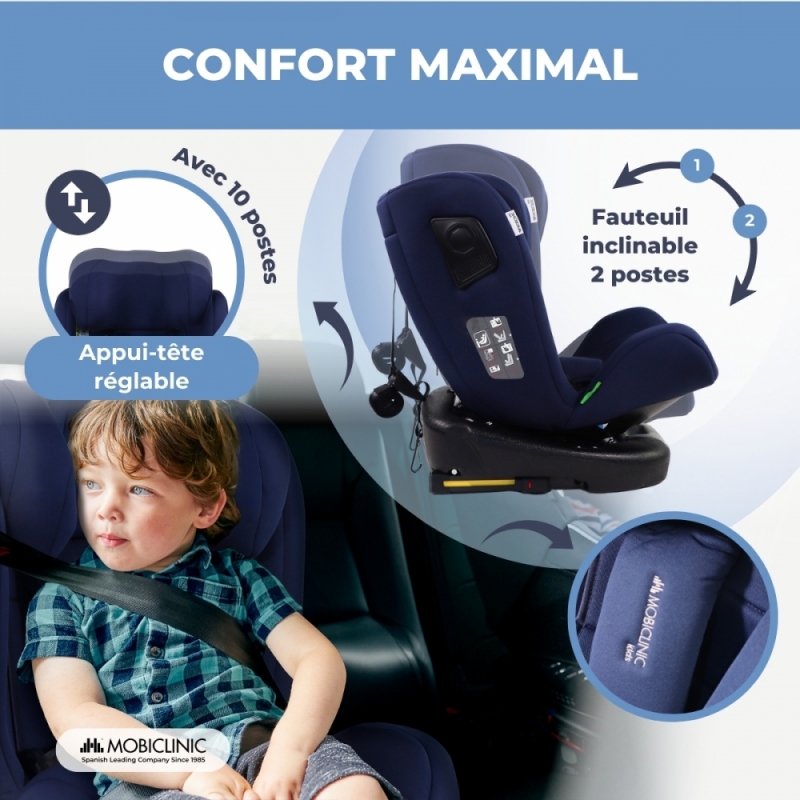 La rotation à 360º de la chaise simplifie sa manipulation et permet à l'enfant d'être facilement positionné sous n'importe quel angle, en plus d'offrir la possibilité d'orienter la chaise vers l'avant ou vers l'arrière, selon son stade de développement. L'appui-tête est réglable sur 10 positions, permettant à la chaise de grandir avec l'enfant, en s'adaptant à tout moment à sa taille. De plus, il dispose de plusieurs positions d’inclinaison vers l’avant et vers l’arrière.