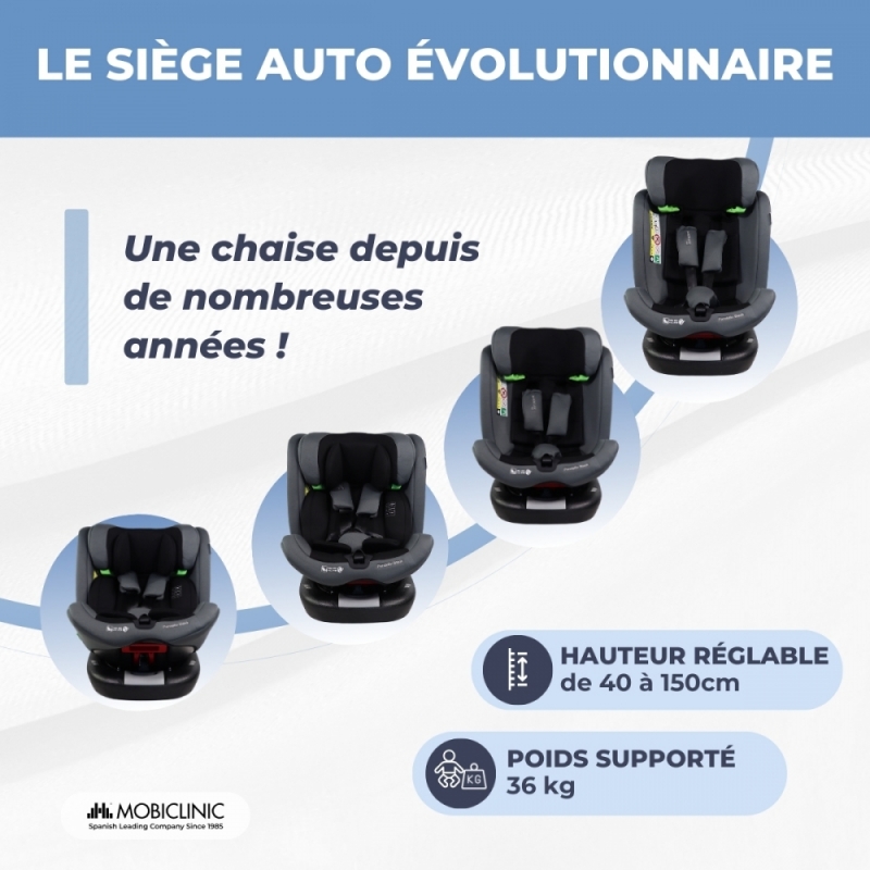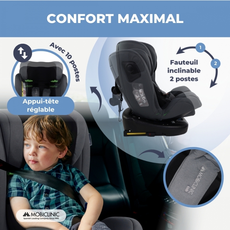La rotation à 360º de la chaise simplifie sa manipulation et permet à l'enfant d'être facilement positionné sous n'importe quel angle, en plus d'offrir la possibilité d'orienter la chaise vers l'avant ou vers l'arrière, selon son stade de développement. L'appui-tête est réglable sur 10 positions, permettant à la chaise de grandir avec l'enfant, en s'adaptant à tout moment à sa taille. De plus, il dispose de plusieurs positions d’inclinaison vers l’avant et vers l’arrière.