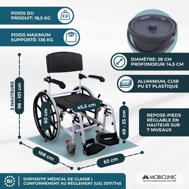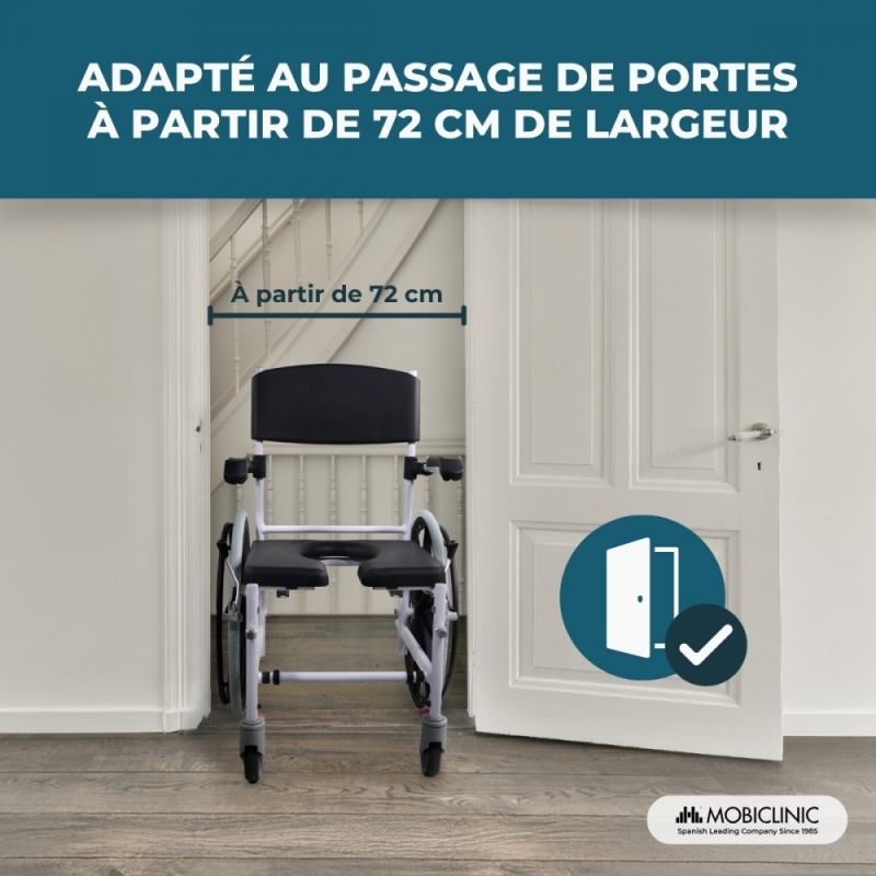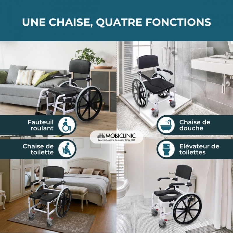 CHAISE MULTIFONCTION : Calígula est une chaise de salle de bain qui facilite le bain de ceux qui en ont besoin, en permettant de placer la chaise dans la douche. Mais c'est aussi une chaise de toilette qui possède un pot amovible, ce qui améliore le confort et la sécurité, et qui peut également être utilisée sur les toilettes (moins de 46 cm de haut et 45 cm de large). Enfin, il peut être utilisé comme chaise de transport pour faciliter les déplacements n'importe où.