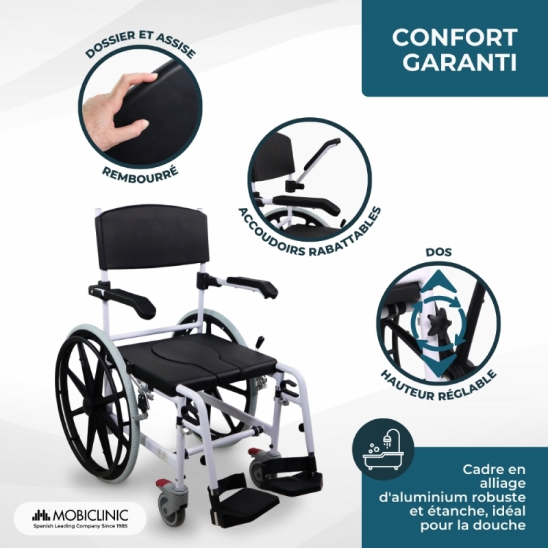 Le fauteuil roulant de salle de bain Caligula est la solution parfaite pour les personnes recherchant confort et fonctionnalité dans leur vie quotidienne. Sa conception multifonctionnelle permet de l'utiliser aussi bien pour le lavage que pour la douche, facilitant les routines d'hygiène personnelle de manière sûre et pratique. De plus, son siège rembourré et ses accoudoirs et repose-pieds rabattables offrent un confort supplémentaire, s'adaptant aux besoins de l'utilisateur.