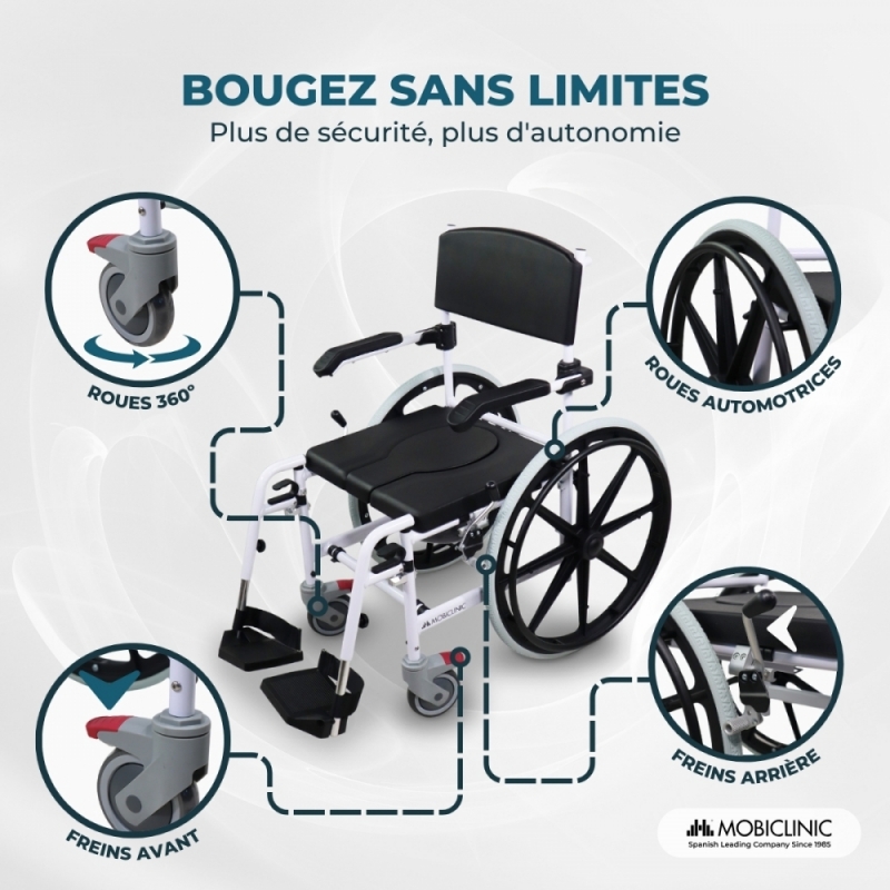 SÉCURISÉ ET AUTOMOTEUR : La chaise de bain comprend des freins sur les roues avant et un levier de frein sur les roues arrière, assurant la sécurité lors de l'utilisation. Les roues arrière sont automotrices, permettant à l'utilisateur de se déplacer avec plus d'indépendance et de confiance dans n'importe quel espace. Cette conception allie confort et autonomie en privilégiant la sécurité de l'utilisateur.