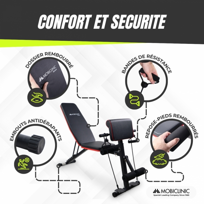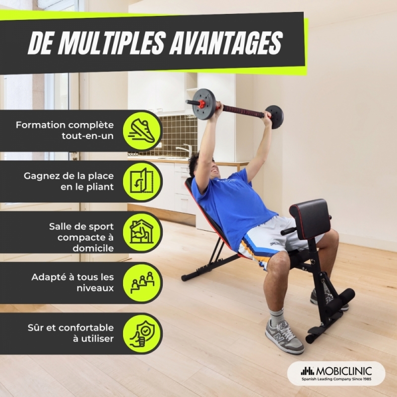 SÉCURITÉ : Fabriqué avec des matériaux de haute qualité tels que l'acier, le bois et le PVC, ce banc est résistant et durable, supportant jusqu'à 120 kg de poids. Il dispose de pointes antidérapantes qui garantissent la sécurité dans chaque exercice, pour un entraînement fiable et sûr.