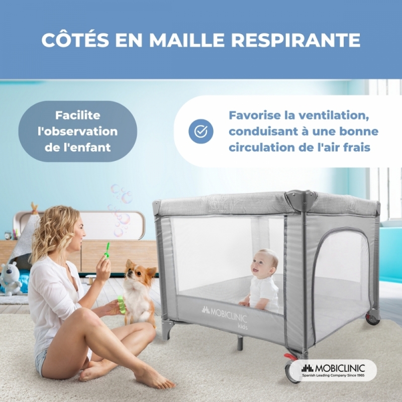 Fabriqué à partir de matériaux de haute qualité, le parc Sleepland est équipé d'un matelas confortable qui offre un soutien idéal pour le repos et le jeu actif. Son tissu en mesh respirant permet une ventilation optimale, assurant aux parents un contact visuel constant avec leurs petits. L'ouverture latérale zippée est un élément pratique qui facilite l'accès, permettant à bébé d'entrer et de sortir tout en jouant.