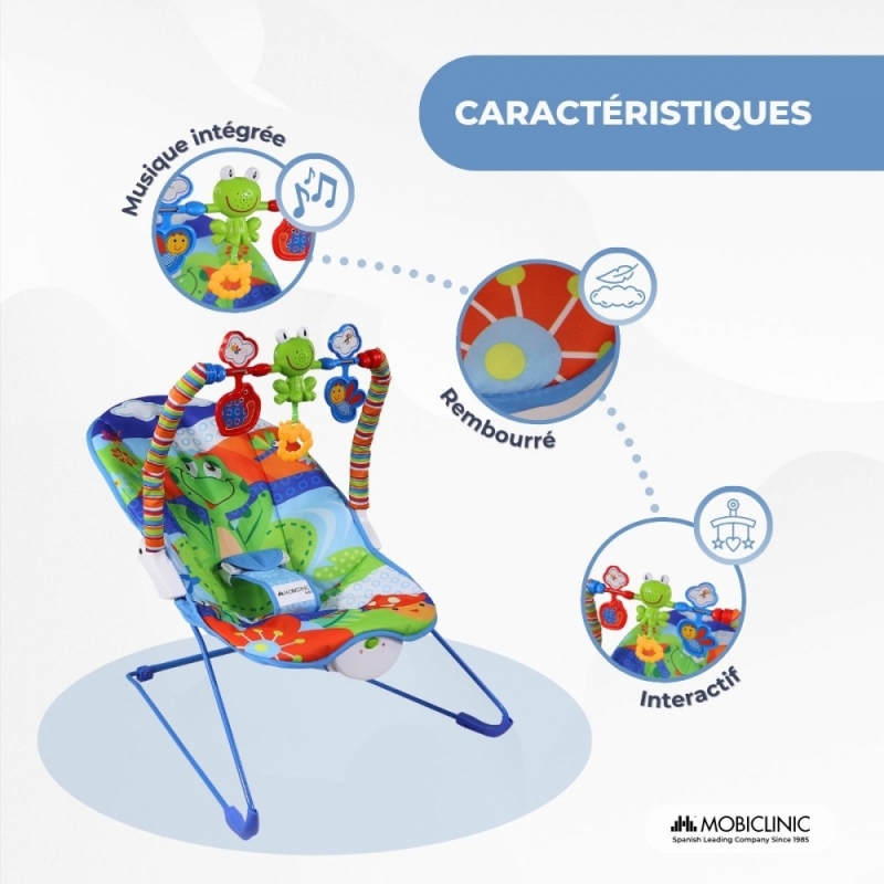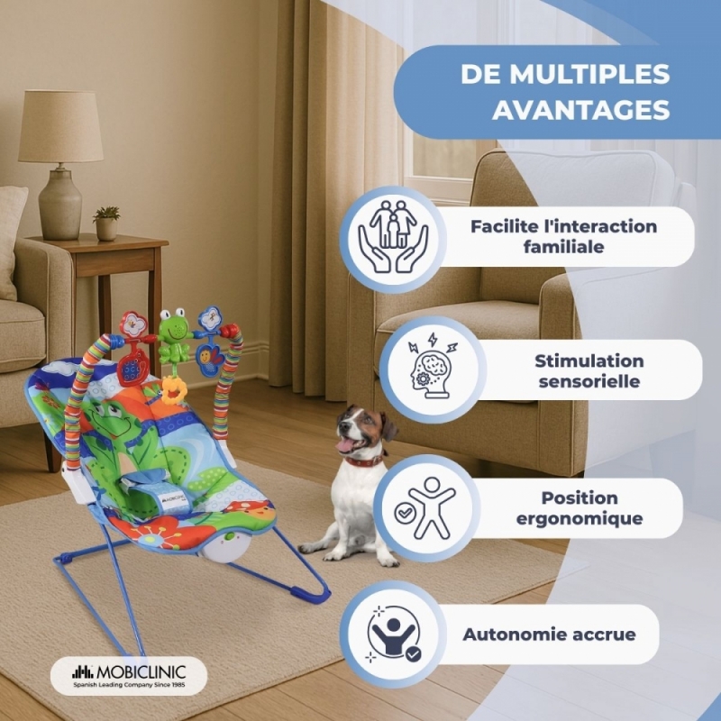 Pour l'option repos, il dispose d'un système de vibration relaxant qui aide à calmer bébé. Cette fonctionnalité est parfaite pour créer un environnement apaisant et confortable. Le hamac comprend également des jouets interactifs qui encouragent le développement sensoriel du bébé, en fournissant des stimuli visuels et sonores pour attirer son attention.