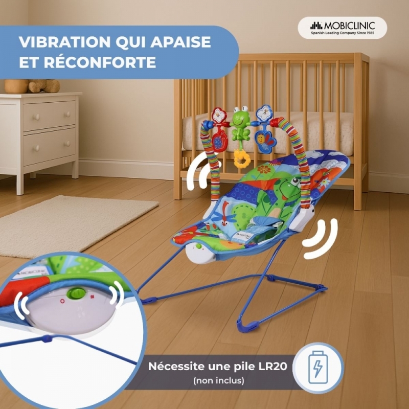 VIBRATION RELAXANTE : Le transat Flash est doté d'un système de vibrations douces qui s'active sous le repose-pieds du siège. Les vibrations aident à calmer et à détendre le bébé, favorisant le repos et offrant un plus grand confort. Une touche de bien-être supplémentaire pour votre petit !