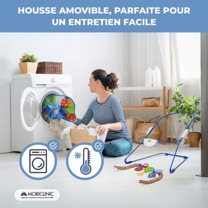 L'entretien du hamac est facile, le tissu du siège est amovible et lavable en machine, ce qui garantit qu'il est toujours prêt à l'emploi. Côté sécurité, le hamac dispose d'une ceinture de sécurité réglable qui maintient bébé au bon endroit, évitant ainsi tout mouvement accidentel. De plus, ses pieds antidérapants offrent une stabilité supplémentaire, garantissant qu'il reste ferme et sécurisé.