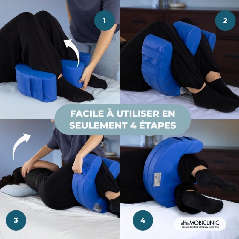 L'utilisation du coussin Folk est intuitive : il suffit de glisser les jambes du patient dans les fentes du coussin, de placer une main sur sa taille ou son dos et, de l'autre, de tenir l'une des poignées latérales pour faire pivoter facilement le coussin. Grâce à sa légèreté et à sa compacité , cette opération peut être réalisée à domicile, en établissement de soins ou en déplacement.