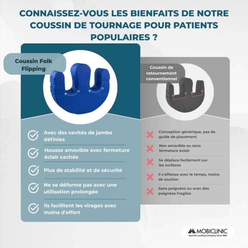 Le coussin de retournement Mobiclinic® Folk a été conçu pour améliorer la prise en charge des patients alités, facilitant les changements posturaux en tout confort et en toute sécurité. Sa forme en U, avec un séparateur de jambes arrondi et deux poignées latérales ergonomiques, permet au soignant de repositionner le patient sans effort, réduisant ainsi les efforts physiques et améliorant l'efficacité des soins quotidiens.