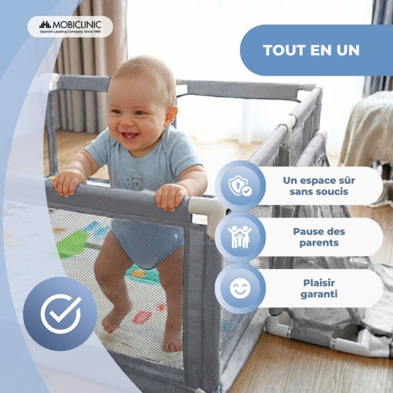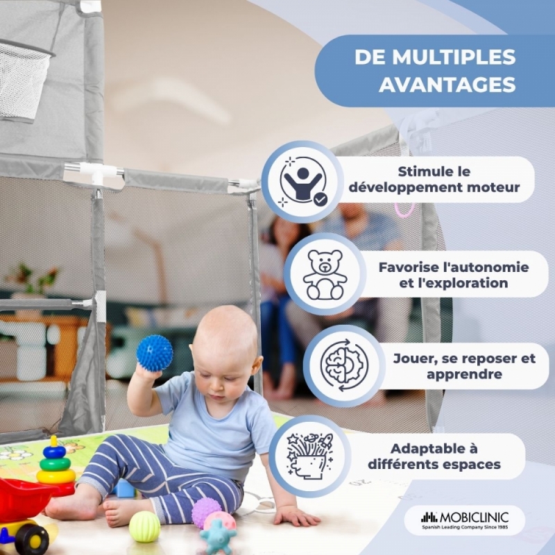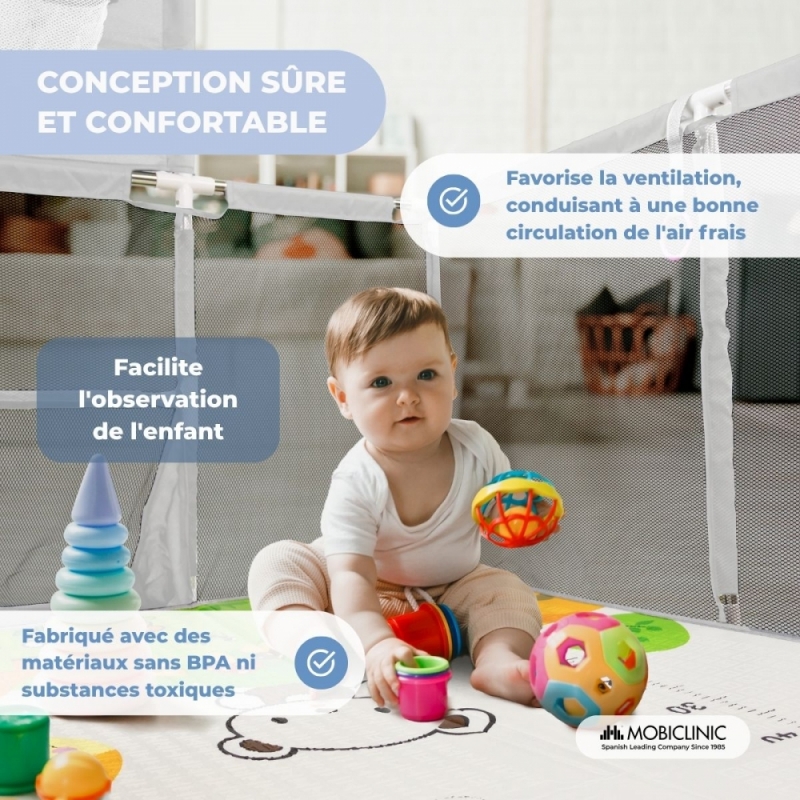 Pour encourager l'autonomie et la coordination des tout-petits, le parc est équipé de quatre anneaux de sécurité conçus pour les aider à apprendre à se tenir debout progressivement et en toute sécurité. Ses parois en filet respirant permettent aux parents de surveiller leur bébé à tout moment et assurent une ventilation constante.