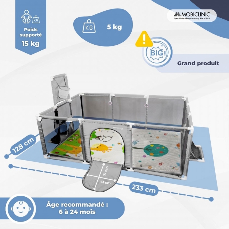 Grâce à ses dimensions de 128 x 233 cm, il offre un espace de jeu spacieux et confortable où les petits peuvent ramper, se tenir debout, jouer ou faire leurs premiers pas en toute sécurité. Le tapis inclus offre également une surface rembourrée qui isole le sol et favorise le jeu ou le repos.