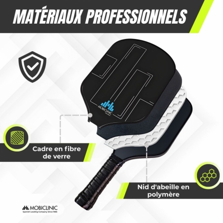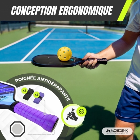 Le set de pickleball Mobiall est idéal pour les débutants comme pour les joueurs expérimentés à la recherche d'une activité physique ludique et complète. Il comprend quatre raquettes en fibre de verre avec un noyau en nid d'abeille en polymère, un matériau alliant contrôle et puissance pendant le jeu. Ses poignées ergonomiques antidérapantes et absorbantes assurent une prise en main confortable.