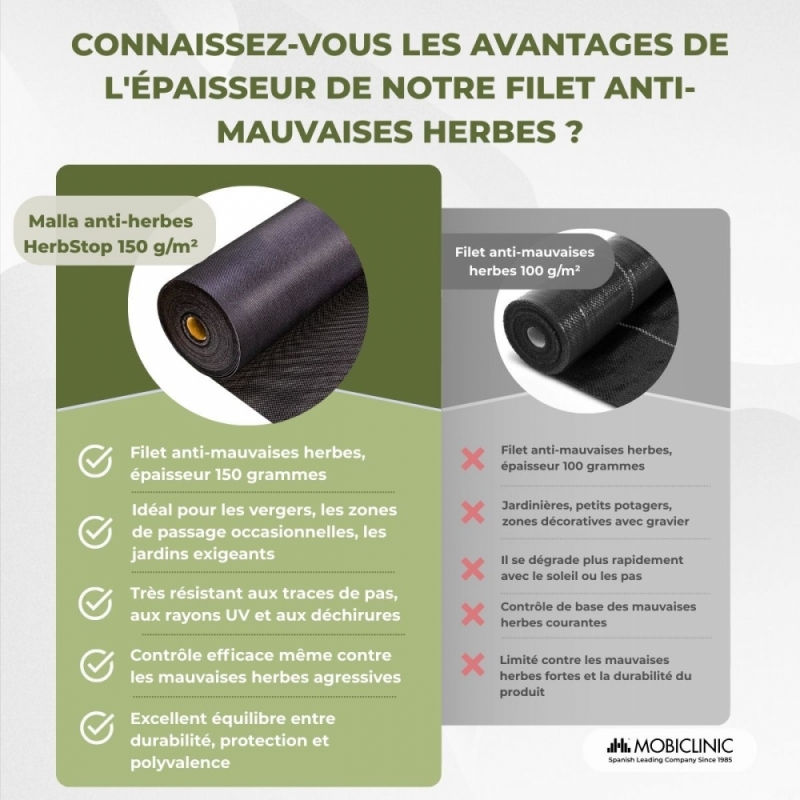 Le filet anti-mauvaises herbes HerbStop est une solution écologique et efficace pour lutter contre la prolifération des mauvaises herbes dans les jardins, les vergers et les serres. Fabriqué en polypropylène robuste d'un grammage de 150 g/m², il offre une durée de vie allant jusqu'à deux ans.