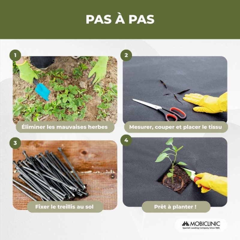 FACILE À INSTALLER : Ce filet anti-mauvaises herbes est facile à installer et se découpe aux ciseaux pour s'adapter à tous les espaces. Son installation ne nécessite aucun outil particulier, ce qui le rend idéal pour un usage domestique et professionnel. Réutilisable et facile à repositionner, il suffit de le recouvrir du sol et de le fixer avec des clous.