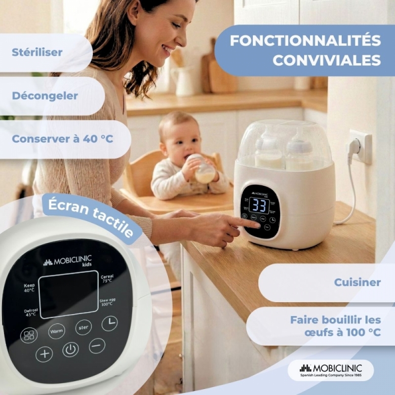 Le panneau de commande vous permet de sélectionner six fonctions différentes selon vos besoins et votre temps : réchauffer des biberons, maintenir leur température, stériliser, décongeler du lait, cuire ou réchauffer des aliments. La température est réglable entre 37 °C et 90 °C, pour s'adapter à chaque utilisation.