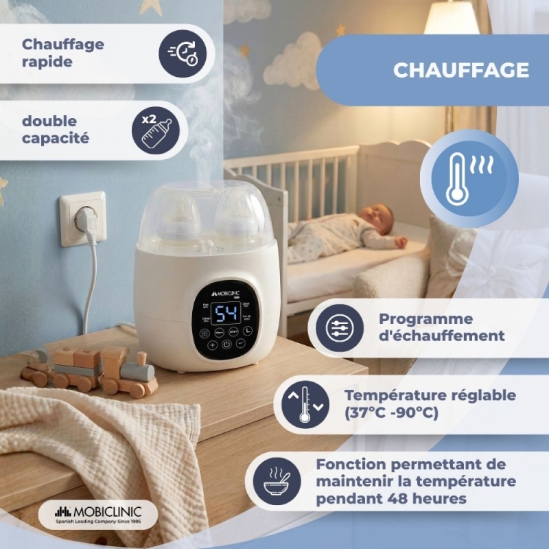 Chauffe-biberon double | 6 en 1 | Stérilisateur | Température réglable | Programmable | Compact | Bibidu | Mobiclinic