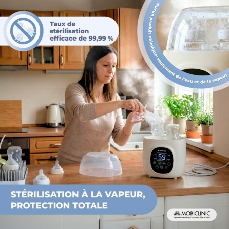 STÉRILISATION SÛRE : Ce chauffe-biberon est doté d'un système de stérilisation à la vapeur haute température avec une efficacité de 99,99 %, éliminant ainsi les bactéries et les germes. Idéal pour désinfecter les ustensiles de bébé, comme les tétines et les biberons, sans aucun appareil supplémentaire.