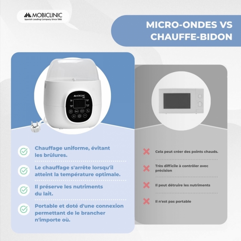 Ses fonctionnalités incluent un chauffage rapide, qui augmente la température de 15 °C au-dessus de la température cible, pour un chauffage efficace et constant. Il dispose également d'une programmation horaire pour que le biberon soit prêt à l'heure souhaitée.
