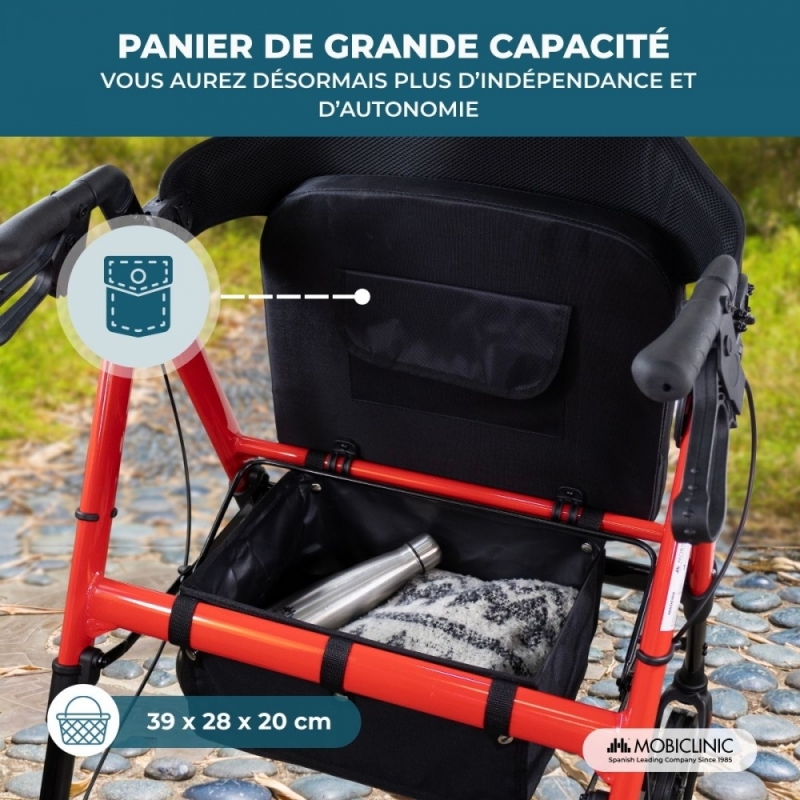 PRATIQUE ET FONCTIONNEL : Comprend un panier de grande capacité (39 × 28 × 20 cm) en tissu Oxford résistant et lavable à la main, ainsi qu'un porte-bâton de marche intégré pour un plus grand confort au quotidien.