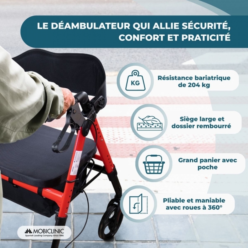 BARIATRIQUE ET RÉSISTANT : Ce déambulateur supporte jusqu'à 204 kg, étant un modèle renforcé qui offre une stabilité et une sécurité maximales, idéal pour les utilisateurs en surpoids ou ceux qui ont besoin d'une plus grande capacité de charge.