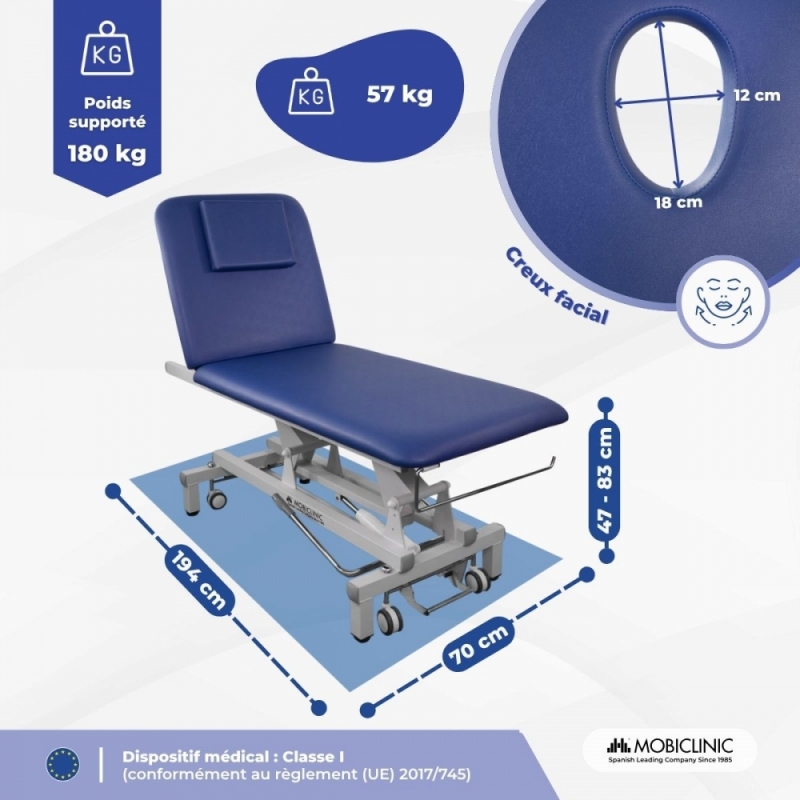 CONCEPTION FONCTIONNELLE : Le brancard hydraulique est doté d'une ouverture faciale anatomique de 11 x 18 x 8,5 cm avec coussinet intégré, pour un confort accru. Sa structure en acier offre une grande résistance à une utilisation intensive et à des nettoyages fréquents. Il comprend un porte-papier hygiénique intégré et sa charge maximale supportée est de 180 kg.
