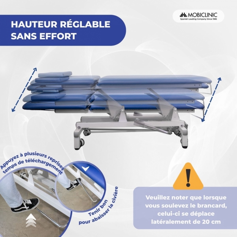 SYSTÈME HYDRAULIQUE : Le brancard est équipé d'un système de réglage de la hauteur assisté par pédale qui permet de le monter ou de l'abaisser en douceur, même lorsque le patient est assis. Il est également doté de leviers latéraux accessibles des deux côtés, simplifiant ainsi le travail des professionnels.
