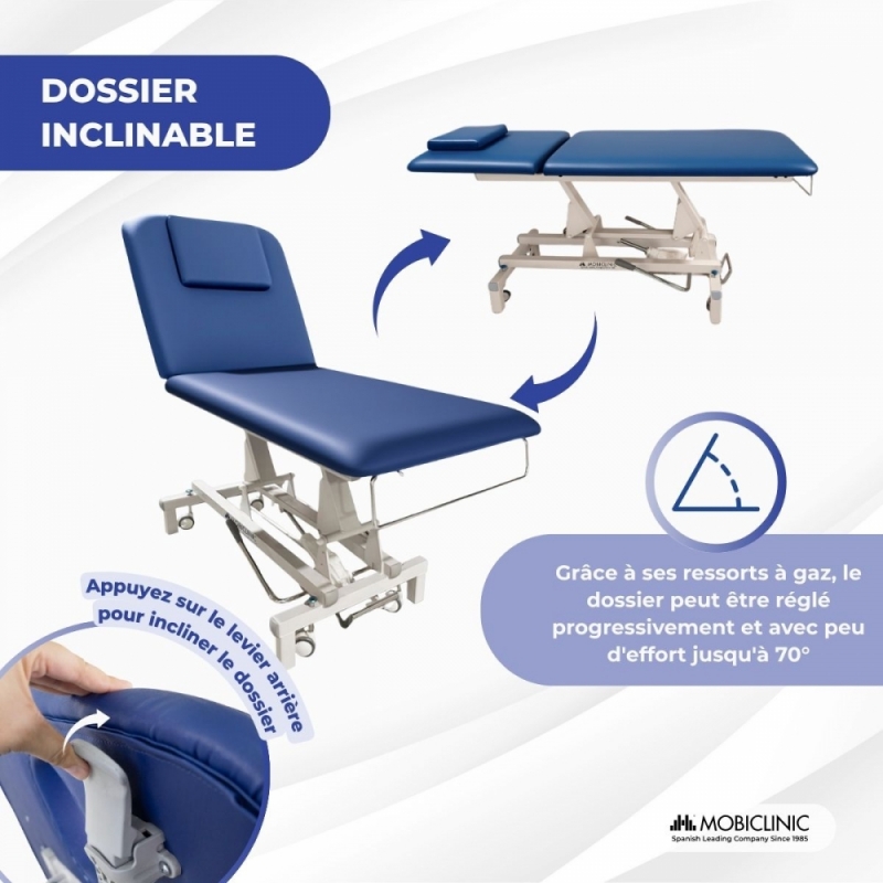 Son dossier s'ajuste de 0° à 70° grâce à des vérins à gaz, permettant une inclinaison progressive et fluide. Il est ainsi idéal pour les traitements en position horizontale et semi-allongée. Le système de réglage de la hauteur assisté par pédale hydraulique élimine les contraintes inutiles. Ses leviers latéraux permettent de travailler de tous les côtés, optimisant ainsi le temps de travail et l'ergonomie.