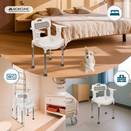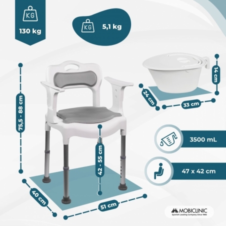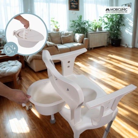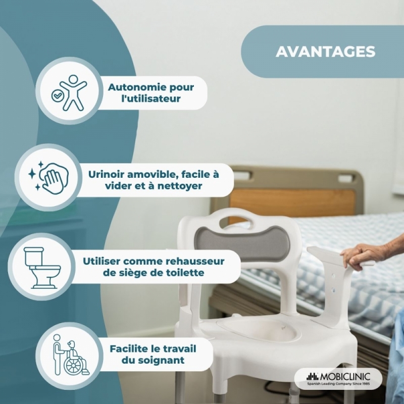 URINOIR INCLUS : Cette chaise est équipée d'un urinoir amovible pouvant supporter jusqu'à 6 kg et d'une capacité allant jusqu'à 3 500 ml, offrant une grande autonomie à l'utilisateur. Le retrait de l'urinoir est très simple, ce qui facilite le nettoyage et garantit une utilisation toujours hygiénique.